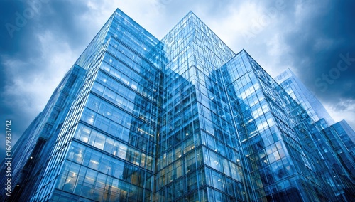 Modern skyscrapers, clad in reflective glass, rise against a dramatic cloudy sky, showcasing a city's architectural grandeur and urban energy.