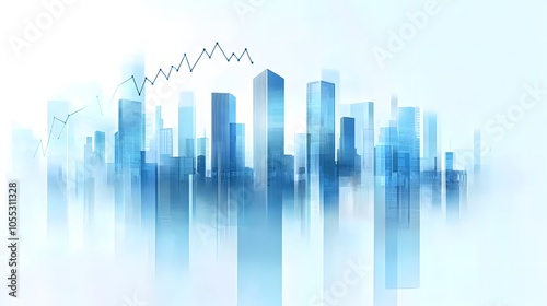 Modern Skyscrapers with Economic Growth Chart Overlays Representing Digital Finance and Analytics in Futuristic, Minimalist Blue and White Cityscape, Highlighting Business and Economic Growth Concepts