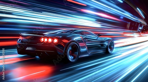 Modern, sleek sports car is speeding through a city at night, creating vibrant light trails that illuminate the scene with motion and energy