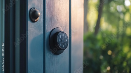 Modern smart door lock on a teal-colored door. Sunlight streams in