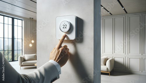 Modern smart thermostat in minimalist interior, person adjusting with ease.