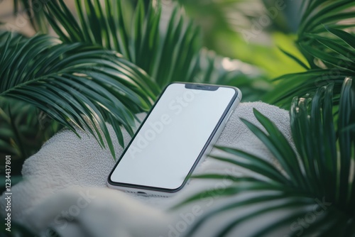 Modern smartphone resting on a soft towel amidst lush green palm leaves in a tropical setting