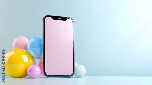 Modern smartphone surrounded by colorful spheres on a soft gradient background, showcasing innovation, technology, and creativity in design aesthetics