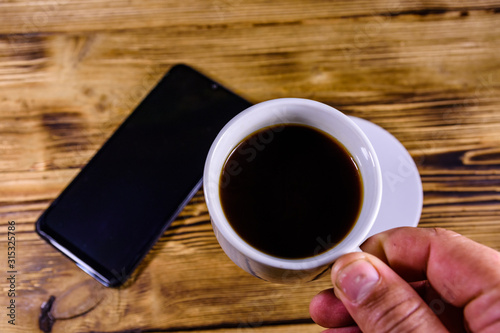 Modern smartphone with blank screen on a wooden background and hand with cup of coffee