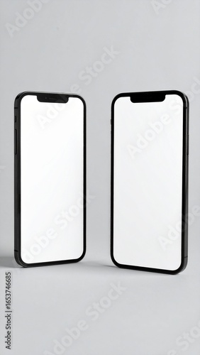 Modern smartphones featuring blank, illuminated displays stand elegantly, offering a clean canvas for digital mockups and technological presentations of various apps and websites.