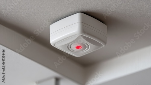 Modern Smoke Detector with Flashing Red Light Mounted on Ceiling in Home Interior