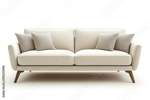 Modern sofa with simple design and clean lines, isolated on white background with soft light and shadow.