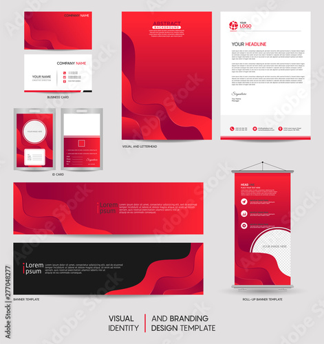 Modern stationery mock up set and visual brand identity with abstract colorful dynamic background shape. Vector illustration mock up for branding, cover, card, product, event, banner, website.