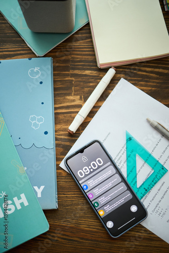 Modern student desk with smartphone with notifications, writing tools, document, pen and notebooks during homework or studying for exams
