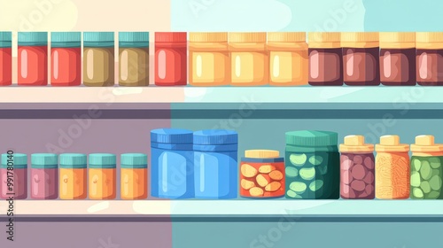 Modern Stylized Vector Illustration of Assorted Canned Food in a Friendly Store Setting with Pastel Background