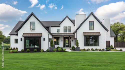 modern suburban farmhouse with stark white walls and contrasting dark trim, surrounded by a meticulously manicured lawn