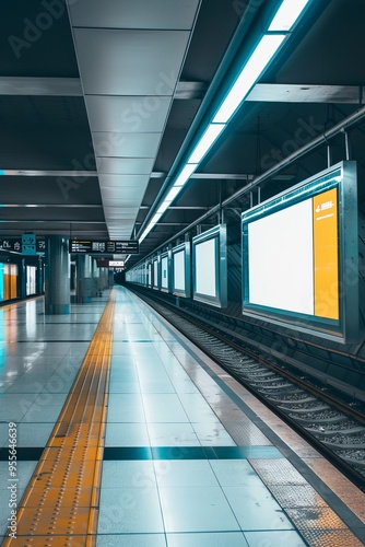 Modern subway station interior with an empty advertising billboard mockup, showcasing urban