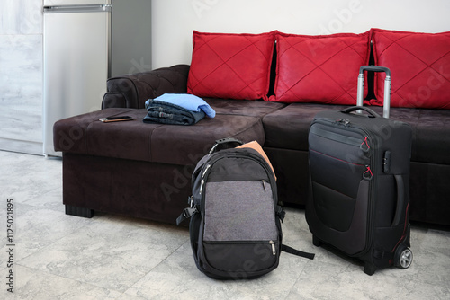 Modern suitcase on wheels and backpack in the living room near the sofa.