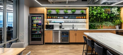 Modern Sustainable Office Kitchen with Energy Efficient Appliances and Smart Refrigerator
