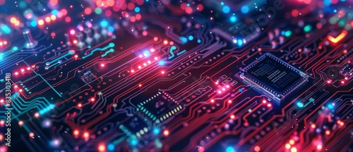 Modern Technology Concept: Motherboard integrated circuit and tech icons illustration. Futuristic background