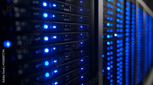 Modern technology data center with rows of advanced server hardware, illuminated by lights, symbolizing cloud computing, big data, and digital security.