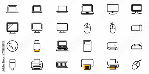Modern technology icons for laptops, computers, mice, printers, and USB drives offer versatile digital asset solutions