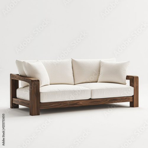 Modern three cushion sofa with brown wood frame and white upholstery, perfect for contemporary living spaces. Its clean lines and cozy design create welcoming atmosphere