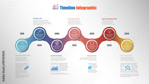 Modern timeline infographic with 7 steps circle designed for template brochure diagram planning presentation process webpages workflow. Vector illustration
