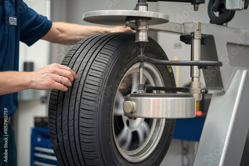 Modern Tire Balancing Machine in Professional Auto Service. Close-up view of a car tire mounted on a professional wheel balancing machine in an automotive workshop.