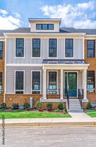 Modern townhouse with horizontal, vertical light gray vinyl siding , square black frame windows, covered porch with white columns curb side appeal on a new construction neighborhood street in Maryland