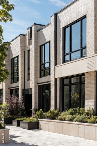 Modern townhouses with large windows and greenery in urban setting under clear blue sky highlight contemporary architectural design and sustainable living
