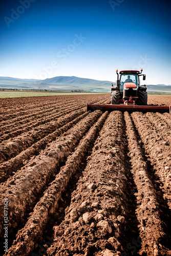 Modern Tractor Plowing Fields: Preparing the Soil for a Bountiful Harvest under a Clear Sky
