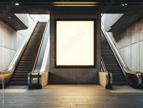 Modern transit area with escalators and blank advertisement panel in a minimalist concrete setting