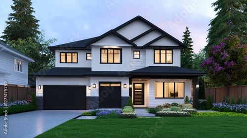 Modern two-story house with landscaped garden during twilight in a suburban neighborhood