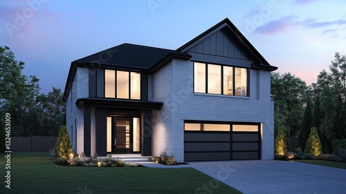 Modern two-story house with large windows and landscaped yard during twilight, showcasing design
