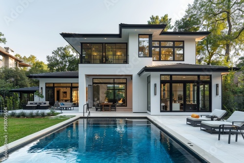 Modern two-story house with large windows, white walls, black window frames, patio, and blue outdoor pool. Contemporary architecture with outdoor seating area.