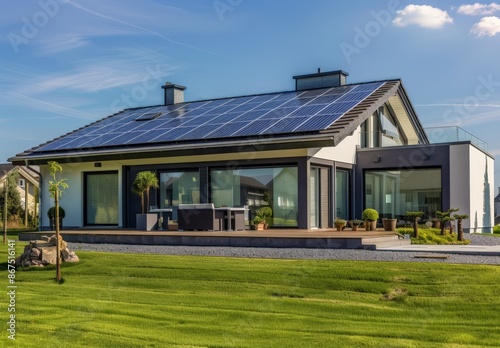 Modern Two-Story House with Solar Panels, Surrounded by Landscaped Yard and Patio