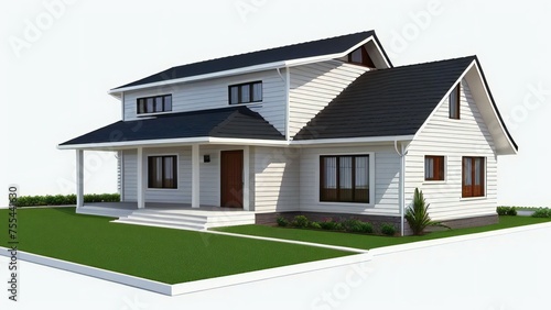 Modern two-story house with white siding, large windows, and a green lawn on a clear day.