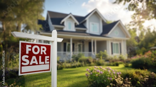 Modern Two-Story Suburban Home for Sale - Light Gray House with Lush Lawn & Red-Letter 'For Sale' Sign (Customizable Space)