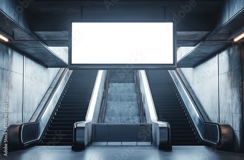 Modern underground passage with twin escalators flanking a central suspended blank billboard, illuminated by linear ceiling lights, cold-toned concrete walls and floor in symmetrical minimalist compos
