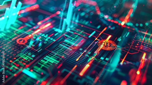 Modern upgraded chip with digital coin symbols, encrypted blockchains. Digital landscape. Technology concept.