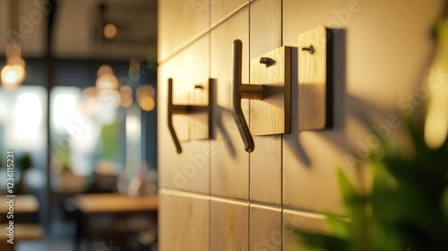 Modern wall mounted gold coat hooks in a restaurant with blurred background