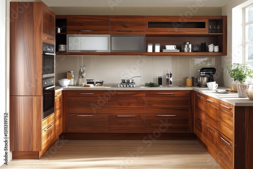 Modern walnut kitchen with built-in appliances. Ideal for interior design, home decor, or real estate websites.