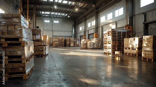 Modern warehouse interior, stacked pallets, efficient layout, clean and organized