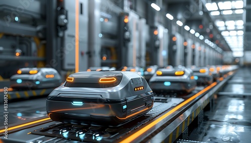 Modern warehouse with automated robots sorting packages on conveyor belts, showcasing advanced logistics technology