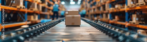Modern Warehouse with Conveyor Belt and Cardboard Boxes in Industrial Storage Facility