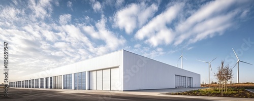 Modern white building with large windows and doors under a blue sky with white clouds.