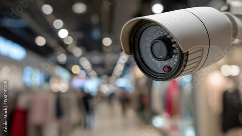 Modern white circular surveillance camera with a glossy finish, mounted in a retail environment. Blurred store interior in background. Clean security concept with caption space on the side.