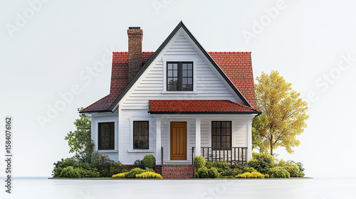 Modern white house with red roof and chimney surrounded by green bushes and trees, featuring wooden door and large windows, evoking cozy and inviting atmosphere