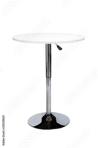 Modern white round adjustable small coffee table on a white background. Side view with clipping path