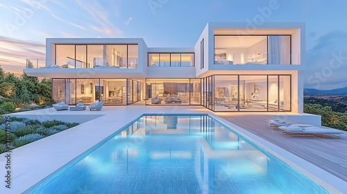 Modern White Villa with Infinity Pool Overlooks a Tranquil Valley at Dusk Beautifully