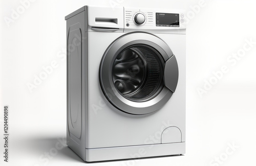 Modern white washing machine stands isolated against white background. Stylish appliance features sleek design, front-loading drum. Machine advanced technology. Contemporary household tech ideal for