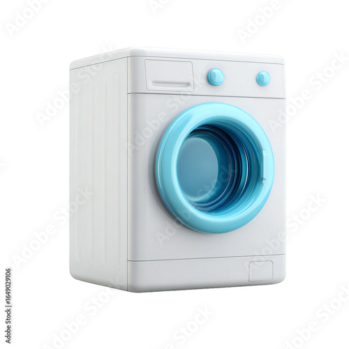 Modern white washing machine with a blue door and drum, isolated on transparent background, representing clean laundry and household chores