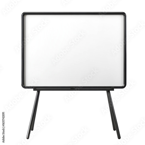 Modern whiteboard with metal frame, standing on tripod legs, ideal for presentations on transparent background