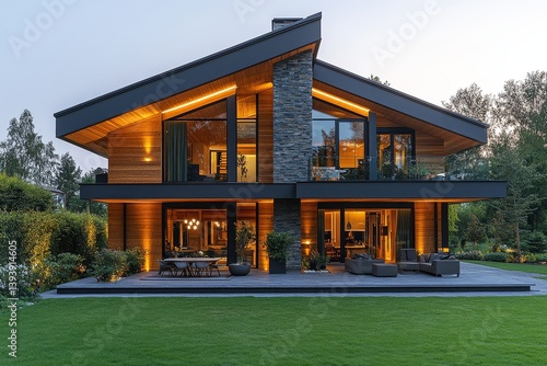 Modern wood and glass house with three floors, gable roof, large terrace overlooking green grassland, and lighting effects at night.